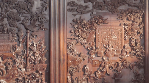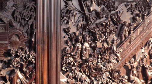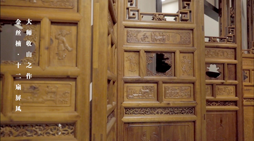 “它的刀法,所有的地兒,像這竹葉后邊,都是鏤空,穿枝過梗,這個(gè)上邊雕的太漂亮了,六七個(gè)人用了七八年吧,因?yàn)橐粋€(gè)地兒一個(gè)地兒雕,再?gòu)牡紫逻@兒掏,很難,這是純手工的,任何一個(gè)地方,稍微掏不好就得重新雕,就得重新?lián)Q木頭。頭三十年前,我玩兒的作品,那時(shí)候有很多的優(yōu)秀的大師,現(xiàn)在那些人都老了,這可以說大家基本上都挑不出它什么毛病。另外這用料是紅酸枝老料,就是泰國(guó)紅酸枝。大家可能認(rèn)為紅酸枝是老撾的好,其實(shí)不然,最好的紅酸枝是印度的,印度之后才是泰國(guó)。我干這行幾十年了,也想犒勞犒勞自己,這件東西我就自己留著玩兒了。”