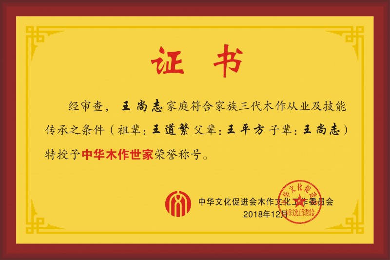 經(jīng)中華木工委認定,王尚志家庭獲譽“中華木作世家”稱號。
