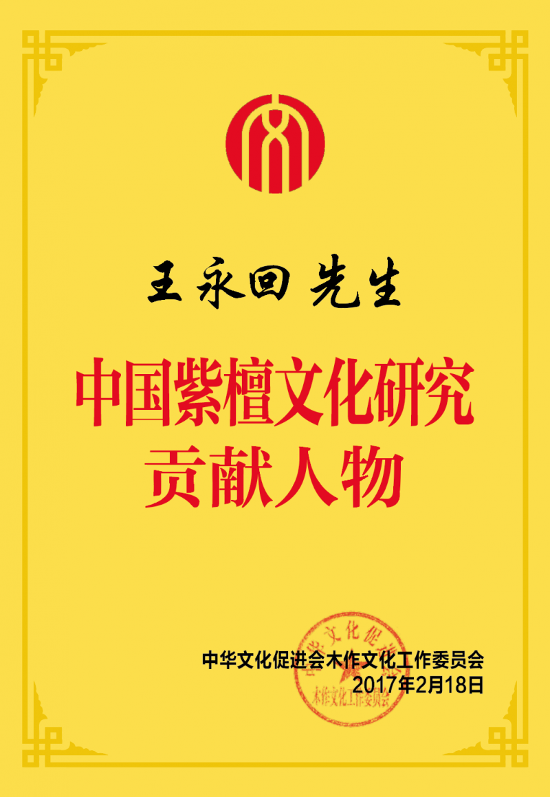 2017年2月18日,在中國(guó)紫檀博物館舉辦的“中國(guó)紫檀文化研究會(huì)”成立會(huì)上,來(lái)自云南瑞麗的萬(wàn)寶紅紅木家具有限公司董事長(zhǎng)王永回獲得了“中國(guó)紫檀文化研究貢獻(xiàn)人物”獎(jiǎng)牌。