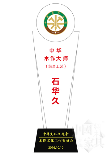 2016年10月10日,中華木工委主辦的“中華木作大師”“中華高級木作師”評審揭曉,在“中華木作大師”頒授儀式上,14位“中華木作大師”陸續(xù)登臺,石華久是其中最年輕的一位。盡管剛剛40歲,但他在木作工藝上所做的突破創(chuàng)新,得到評審專家的高度肯定和認可,因而被授予了“綜合工藝”領域的“中華木作大師”榮譽。