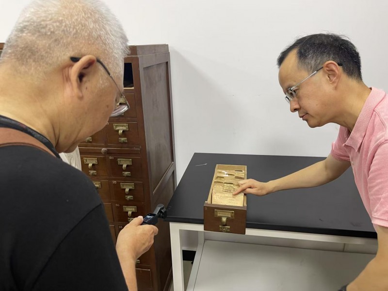 殷亞方(右)向趙夫瀛(左)介紹早些年的標本資料