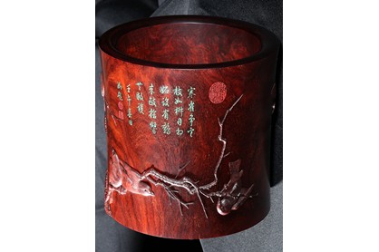 精選血檀工筆精雕寒雀圖筆筒